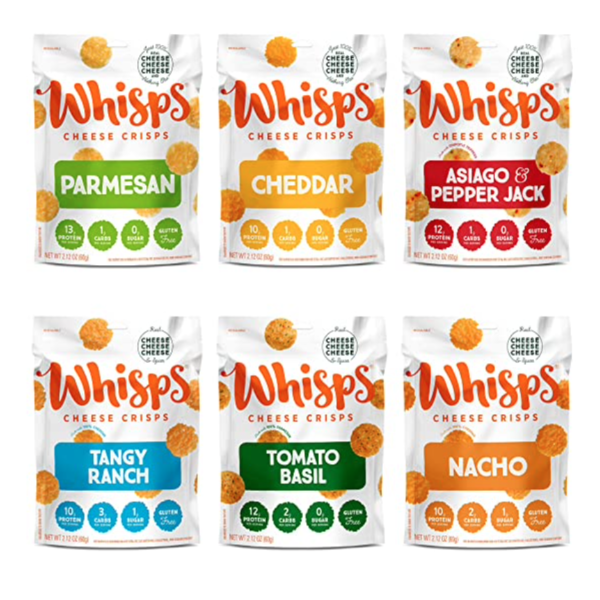 Whisps Cheese Crisps 6-Flavor Variety Pack | Parmesan, Cheddar, Asiago & Pepper Jack, Tangy Ranch, Tomato Basil, Nacho | Keto Snack, Gluten Free, Low Sugar, Low Carb, High Protein | 2.12oz (6 Pack)